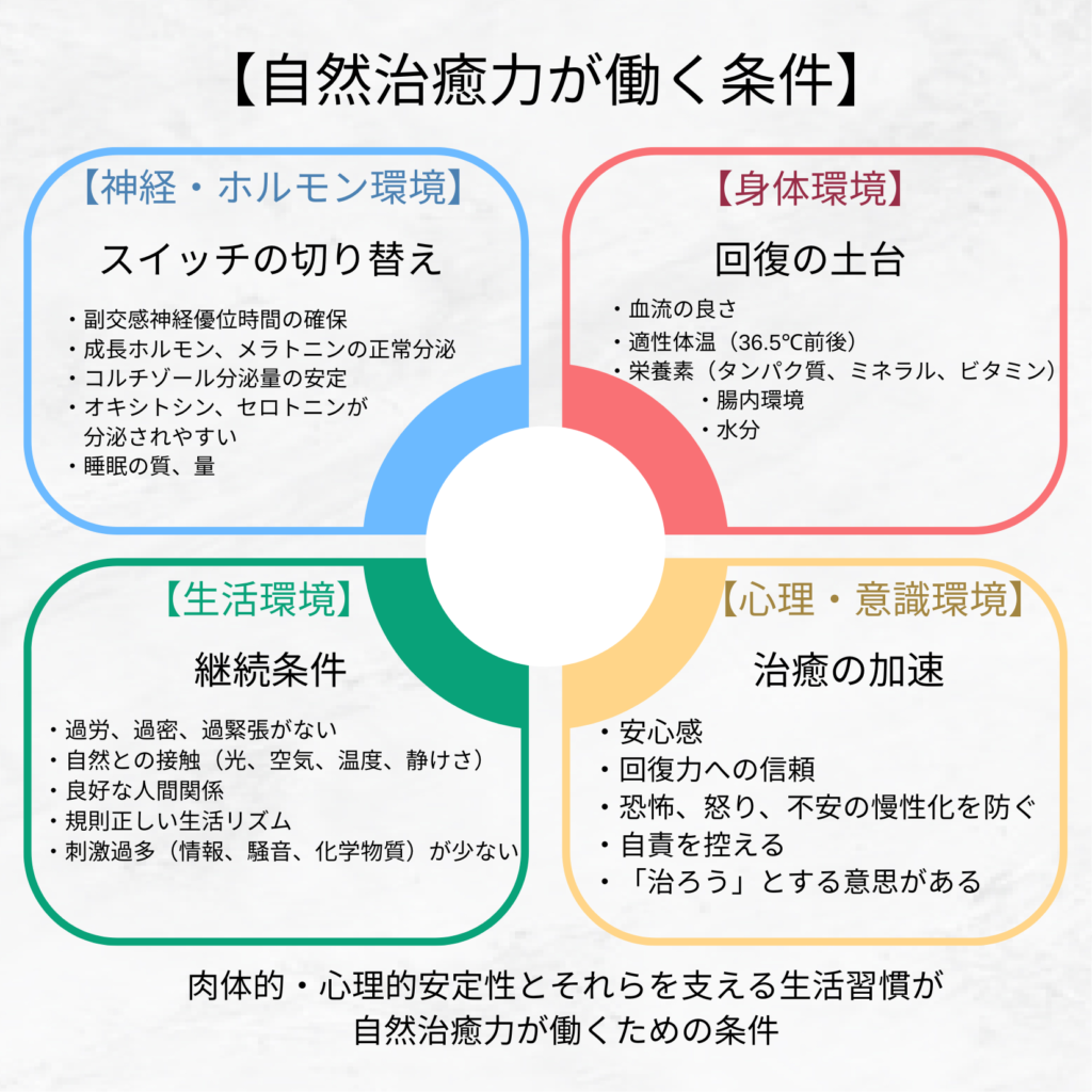 このように肉体的・心理的安定性とそれらを支える生活習慣が自然治癒力が働くための条件となります。
