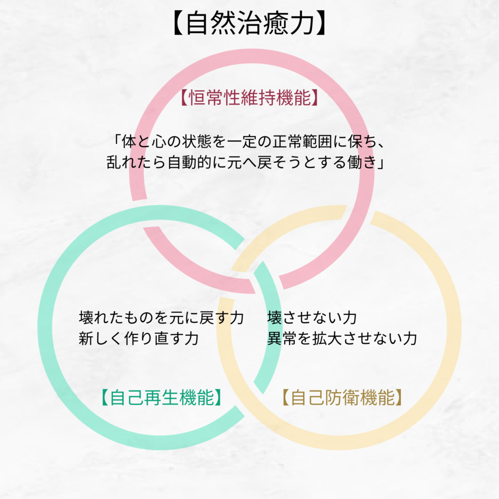 ・自然治癒力には『自己再生機能』『自己防衛機能』『恒常性維持機能』があり、相互作用によって自然治癒力が働く